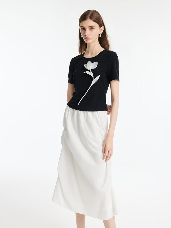 3D Rose T-Shirt And Ruched Skirt Two-Piece Set