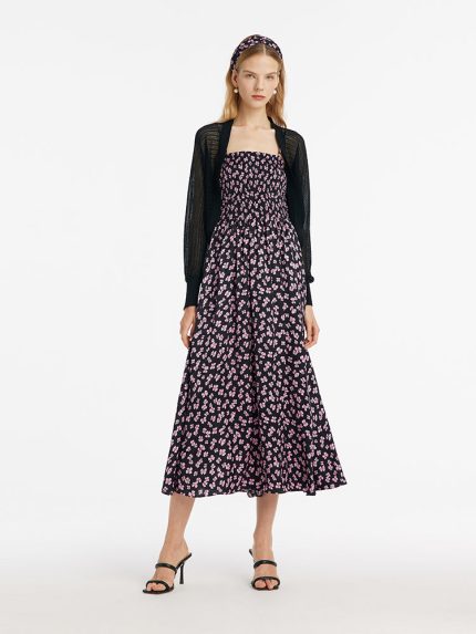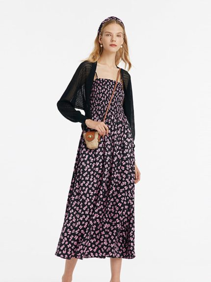 Bowknot Printed Spaghetti Strap Maxi Dress And Knitted Cardigan Two-Piece Set With Scrunchie