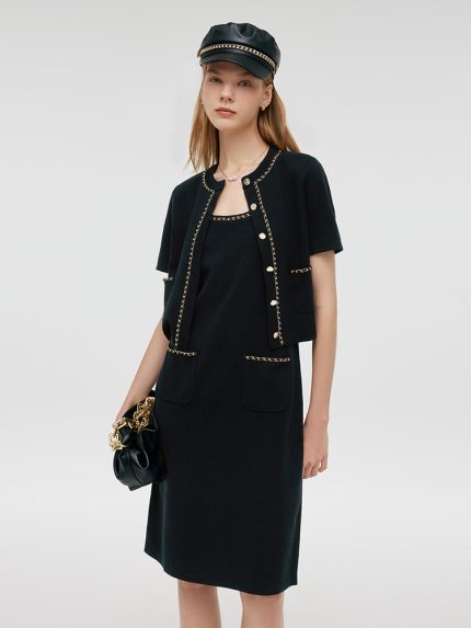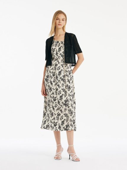 Camellia Printed Spaghetti Strap Dress And Knitted Cardigan Two-Piece Set